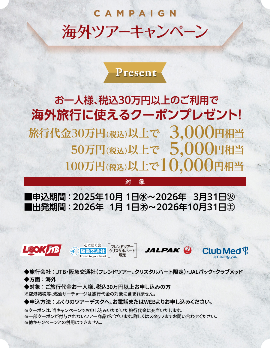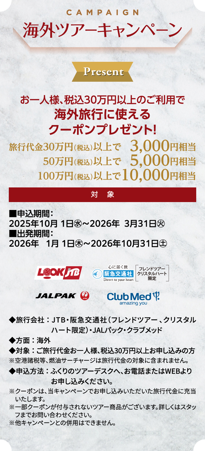 国内外のパッケージツアーなどの豊富な旅行商品を、当クラブ会員様限定でお申込み・ご相談いただけるツアーデスクです。様々なツアーをご用意しており、最大12%補助などお得な会員特典がございますので旅行の計画はふくりのツアーデスクをご利用ください。