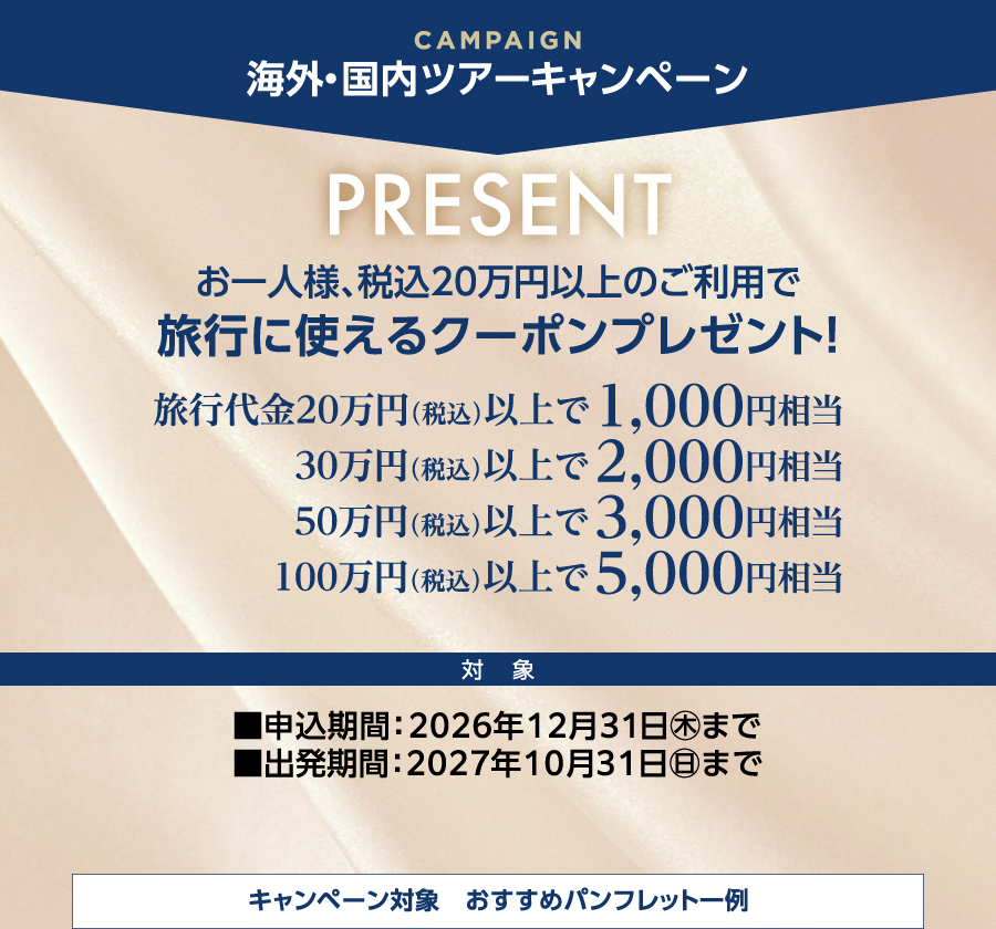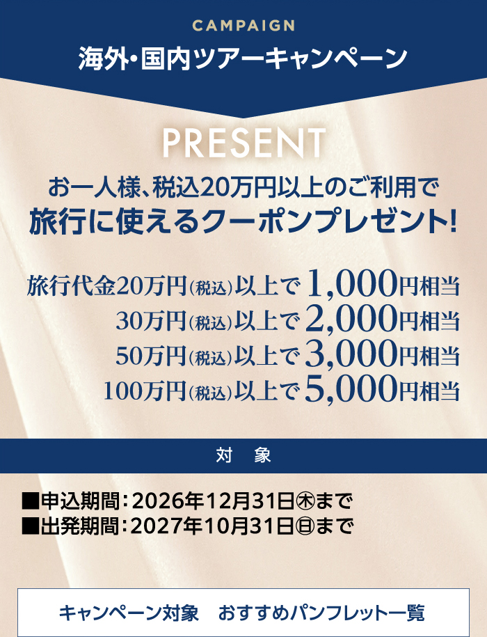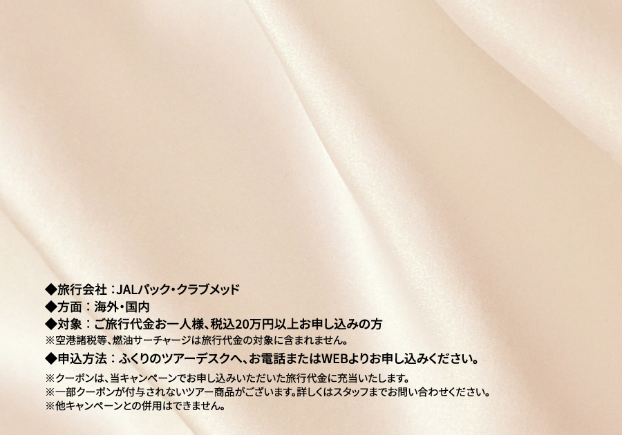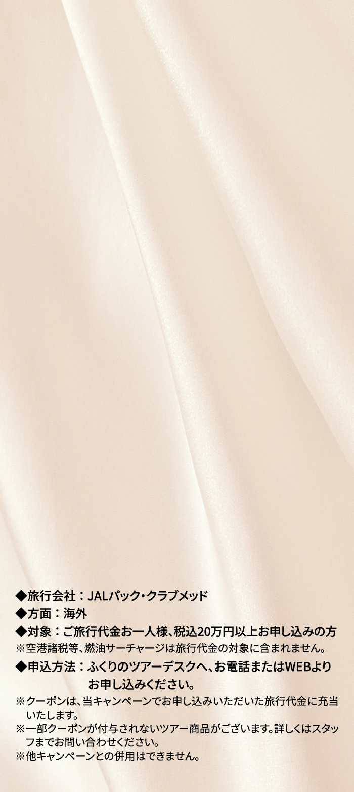 国内外のパッケージツアーなどの豊富な旅行商品を、当クラブ会員様限定でお申込み・ご相談いただけるツアーデスクです。様々なツアーをご用意しており、最大12%補助などお得な会員特典がございますので旅行の計画はふくりのツアーデスクをご利用ください。